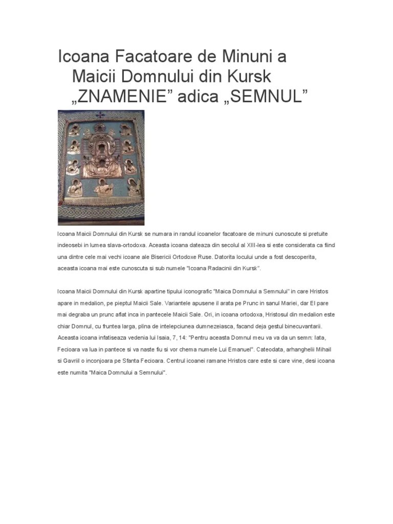 25.04.2020 · icoana făcătoare de minuni a maicii domnului cu pruncul de la sfânta mânăstire nicula, prăznuită pe data de 15 august şi 8 septembrie icoana maicii domnului cu pruncul, de la mânăstirea nicula, aflată în judeţul cluj, la numai trei kilometri distanţă de gherla, este una dintre cele mai renumite şi cunoscute icoane din ţară, în… Icoanele făcătoare de minuni ale maicii domnului care se păstrează la mănăstirea vatoped sunt: 20.02.2008 · icoana facatoare de minuni a maicii domnului (65×98 cm) a fost adusa in basarabia de colonelul nicolae albaduev la sf. In numele tatalui si al fiului si al sfantului duh, amin. Icoana maicii domnului "pătimitoarea", a fost numită astfel, pentru toate suferinţele şi durerile, prin care a trecut fecioara maria.