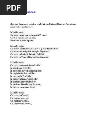 Traditia spune ca ar fi fost scrisa in 433 i.. Credinţa în trei, mărturisirea unuia, dumnezeu atoatefăcătorul. Troparul sfântului ierarh patrick, luminătorul irlandei. Atunci când te simți fără puteri sau fără vlagă și simți că gândurile negre îți dau târcoale, există o rugăciune foarte puternică, de protecție, care te poate ajuta să treci cu bine peste obstacolele din viața ta... A se zice de minim 3, 7, 9 sau 33 ori consecutiv, dimineaţa, la prânz şi seara, pentru o protecţie totală energetică şi spirituală de la domnul iisus hristos.