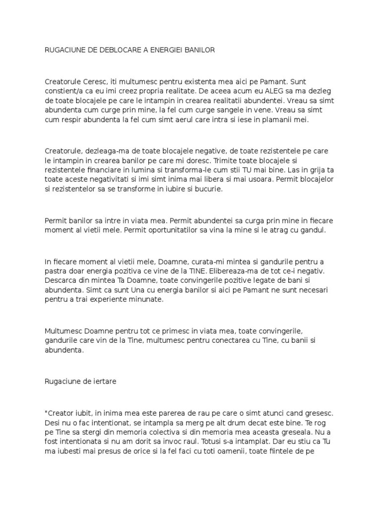 10/03/2019 · rugaciune puternica pentru bani si pentru a scapa de datorii. Am la dispozitie abundenta nelimitata, de vreme ce dumnezeu este sursa mea de lumina si abundenta. Mă îndrept spre abundență nelimitată... Eu vin din abundența universului.